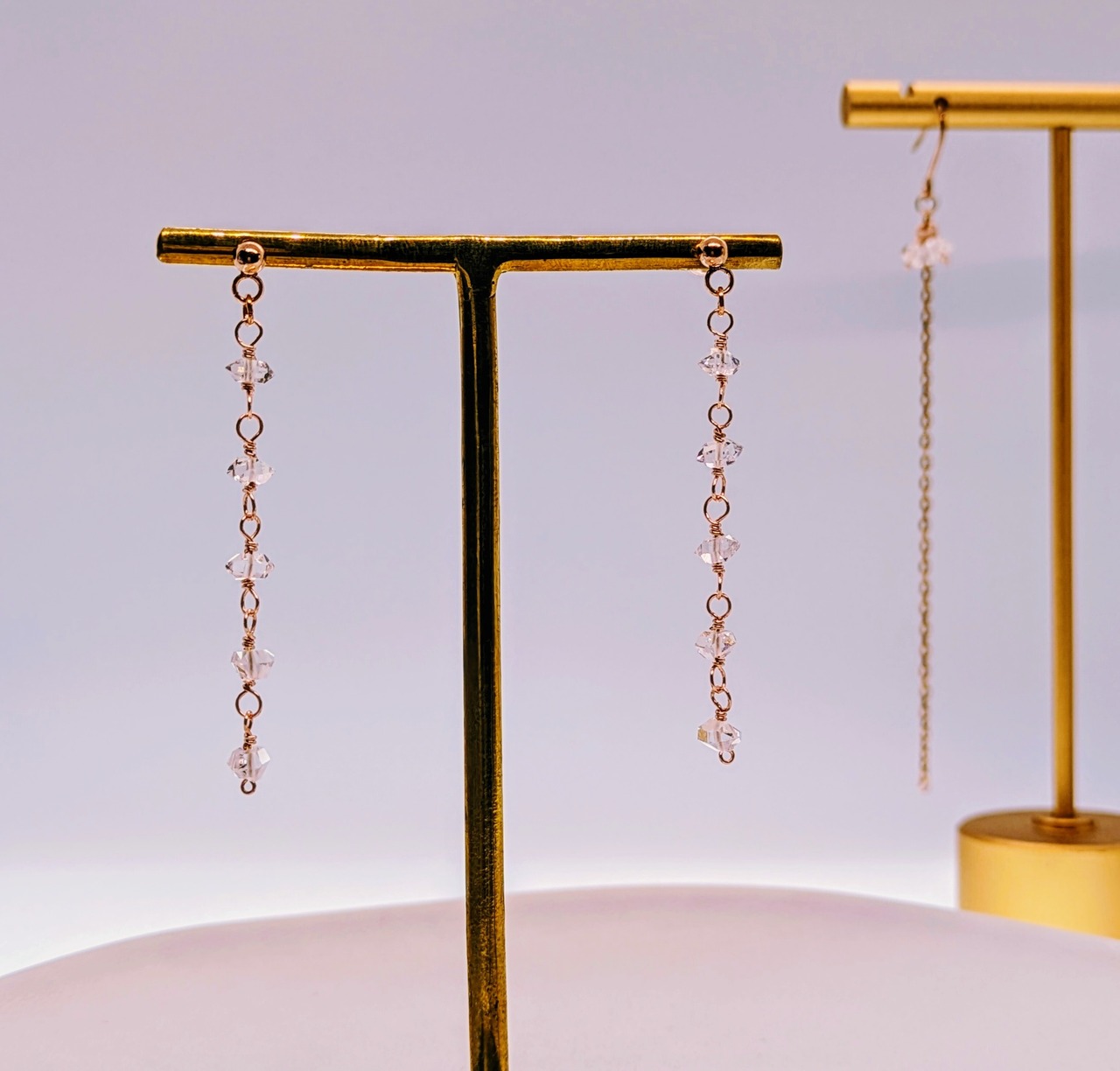 透明感あふれるパキスタン産ハーキマー水晶を6粒あしらった、しなやかなロングデザインのピアス。
