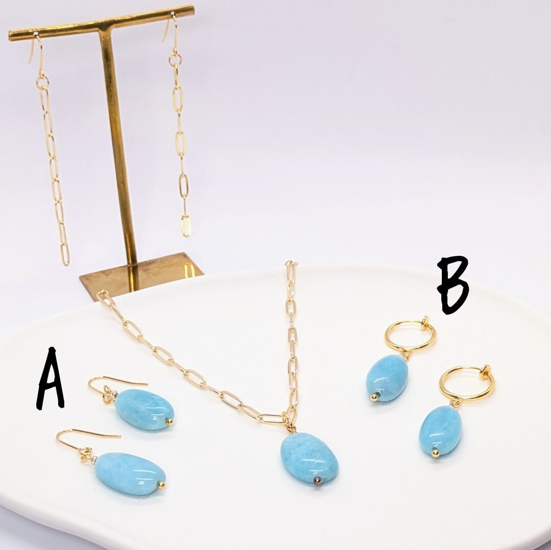 存在感のある大きめのアマゾナイトを、ひと粒でシンプルに仕立てました。顔まわりを明るく爽やかに演出します。